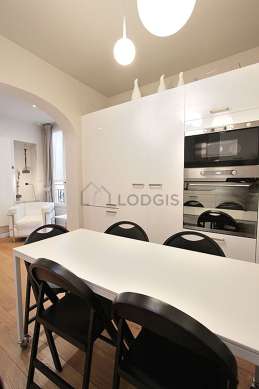 Cet appartement dispose d'une magnifique cuisine avec du parquet au sol et tout l'équipement essentiel pour votre quotidien : plaques de cuisson, réfrigerateur, congélateur, four, micro ondes, hotte, grille pain, bouilloire électrique, cafetière, table à manger, placard, vaisselle, 5 chaise(s).