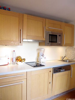 Cet appartement dispose d'une belle cuisine avec du parquet au sol et tout l'équipement essentiel pour votre quotidien : plaques de cuisson, réfrigerateur, micro ondes, freezer, hotte, grille pain, placard, vaisselle.