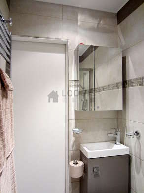 Cet appartement est équipé d'une salle de bain magnifique et claire. Cette salle d'eau bénéficie du nécessaire pour votre bien-être au quotidien : serviettes de bain, etagère, placard, douche séparée, sèche cheveux, sanibroyeur, radiateur sèche-serviettes. Les toilettes sont intégrées dans la salle de bain.