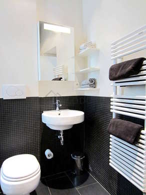 Cet appartement est équipé d'une salle de bain agréable et claire avec des fenêtres. Cette salle d'eau bénéficie du nécessaire pour votre bien-être au quotidien : serviettes de bain, penderie, etagère, placard, douche séparée, sèche cheveux, radiateur sèche-serviettes. Les toilettes sont intégrées dans la salle de bain.