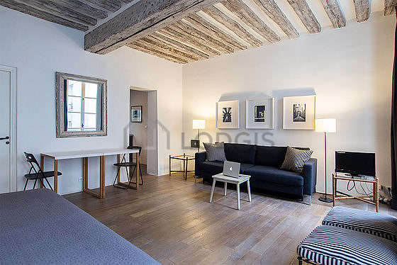 Cet appartement est composé d'un charmant salon avec du parquet au sol et des fenêtres et vue sur rue. Ce salon est meublé et équipé pour rendre votre séjour agréable : télé, draps, couettes, table à manger, table basse, etagère, commode, 4 chaise(s), tabouret1 lit(s) de 140cm, 1 canapé(s) lit(s) de 140cm.