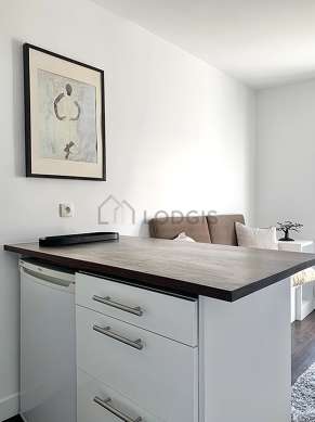Cet appartement dispose d'une belle cuisine avec du linoleum au sol et tout l'équipement nécessaire pour votre quotidien : plaques de cuisson, réfrigerateur, micro ondes, freezer, cafetière, placard, vaisselle.