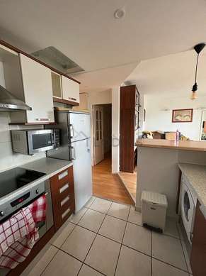 Cet appartement dispose d'une belle cuisine avec du carrelage au sol et tout l'équipement essentiel pour votre quotidien : plaques de cuisson, réfrigerateur, four, micro ondes, hotte, grille pain, bouilloire électrique, cafetière, placard, vaisselle.