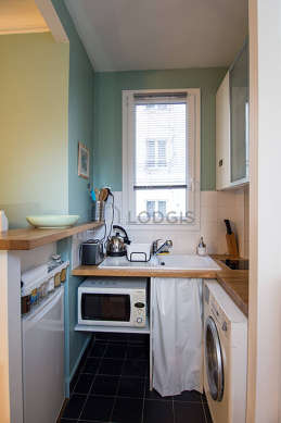 Cet appartement dispose d'une belle cuisine avec du carrelage au sol et tout l'équipement nécessaire pour votre quotidien : plaques de cuisson, réfrigerateur, congélateur, micro onde combiné, hotte, grille pain, bouilloire électrique, cafetière, vaisselle.