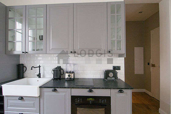 Cet appartement dispose d'une belle cuisine avec du parquet au sol et tout l'équipement indispensable pour votre quotidien : plaques de cuisson, réfrigerateur, four, micro ondes, hotte, grille pain, bouilloire électrique, placard, vaisselle, robot ménager.