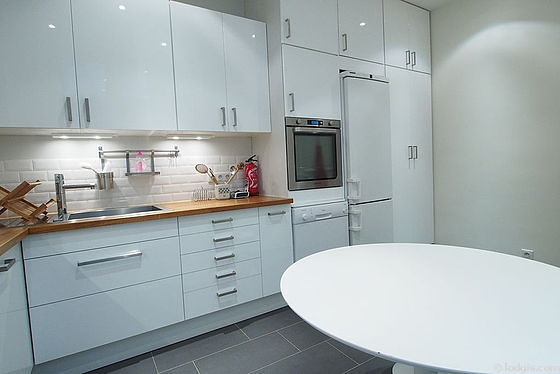 Cet appartement dispose d'une belle cuisine et tout l'équipement indispensable pour votre quotidien : plaques de cuisson, réfrigerateur, congélateur, four, hotte, grille pain, bouilloire électrique, table à manger, etagère, vaisselle.