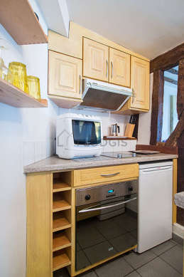 Cet appartement dispose d'une belle cuisine avec du carrelage au sol et tout l'équipement indispensable pour votre quotidien : plaques de cuisson, réfrigerateur, four, micro ondes, freezer, hotte, grille pain, bouilloire électrique, cafetière, etagère, placard, vaisselle.