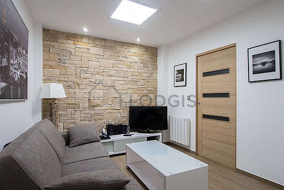 Cet appartement est composé d'un charmant salon avec du carrelage au sol et des fenêtres. Ce salon calme est meublé et équipé pour rendre votre séjour agréable : télé, draps, couettes, table basse, etagère1 canapé(s) lit(s) de 140cm.