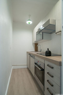 Cet appartement dispose d'une belle cuisine avec du parquet au sol et tout l'équipement essentiel pour votre quotidien : plaques de cuisson, réfrigerateur, congélateur, four, micro ondes, hotte, cafetière, placard, vaisselle.
