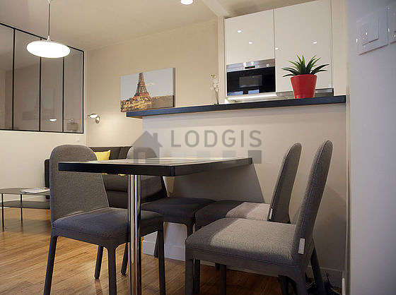 Cet appartement dispose d'une magnifique cuisine avec du parquet au sol et tout l'équipement nécessaire pour votre quotidien : plaques de cuisson, réfrigerateur, congélateur, four, micro ondes, hotte, grille pain, bouilloire électrique, cafetière, placard, vaisselle.