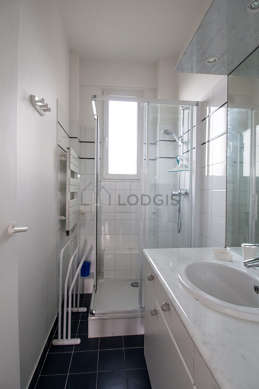 Cet appartement est équipé d'une salle de bain agréable et claire avec des fenêtres double vitrage. Cette salle d'eau bénéficie du nécessaire pour votre bien-être au quotidien : serviettes de bain, placard, douche séparée, sèche cheveux, radiateur sèche-serviettes. Les toilettes sont séparées de la salle de bain et situées dans une pièce indépendante.
