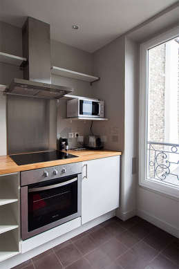 Cet appartement dispose d'une belle cuisine avec du carrelage au sol et tout l'équipement indispensable pour votre quotidien : plaques de cuisson, réfrigerateur, congélateur, four, micro ondes, hotte, grille pain, bouilloire électrique, cafetière, etagère, placard, vaisselle.