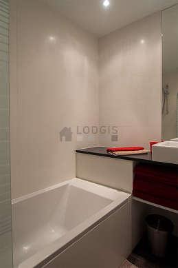 Cet appartement est équipé d'une salle de bain agréable. Cette salle d'eau bénéficie du nécessaire pour votre bien-être au quotidien : serviettes de bain, etagère, baignoire, sèche cheveux, radiateur sèche-serviettes. Les toilettes sont séparées de la salle de bain et situées dans une pièce indépendante.