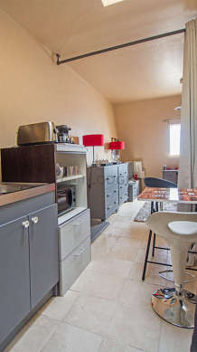 Cet appartement dispose d'une belle cuisine avec du carrelage au sol et tout l'équipement nécessaire pour votre quotidien : plaques de cuisson, micro ondes, freezer, bouilloire électrique, cafetière, placard, vaisselle.