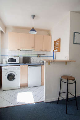 Cet appartement dispose d'une belle cuisine avec du carrelage au sol et tout l'équipement nécessaire pour votre quotidien : plaques de cuisson, réfrigerateur, micro ondes, freezer, hotte, bouilloire électrique, cafetière, etagère, placard, vaisselle, tabouret.