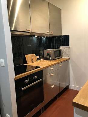 Cet appartement dispose d'une belle cuisine avec de la tomettes au sol et tout l'équipement nécessaire pour votre quotidien : plaques de cuisson, réfrigerateur, four, micro ondes, freezer, hotte, grille pain, bouilloire électrique, cafetière, etagère, placard, vaisselle.