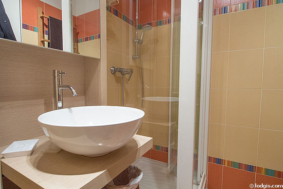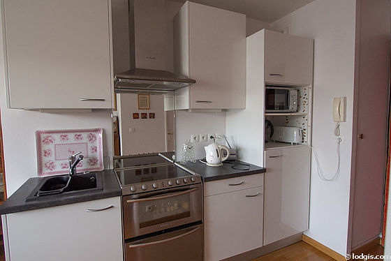 Cet appartement dispose d'une belle cuisine avec du parquet au sol et tout l'équipement indispensable pour votre quotidien : plaques de cuisson, réfrigerateur, four, micro ondes, freezer, hotte, grille pain, bouilloire électrique, cafetière, etagère, vaisselle.