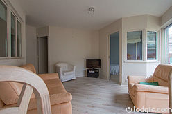 Cet appartement est composé d'un charmant salon avec du parquet au sol et des fenêtres et vue sur jardin. Ce salon très calme est meublé et équipé pour rendre votre séjour agréable : télé, canapé, 1 fauteuil(s), table à manger, 5 chaise(s).