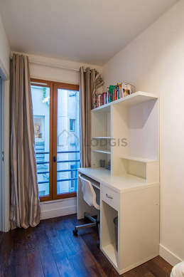 Avec du parquet au sol et des fenêtres double vitrage et vue sur cour, cette chambre séduisante offre l'équipement nécessaire pour vous reposer pendant votre séjour : draps, couettes, bureau, penderie, etagère, 1 chaise(s)1 lit(s) de 90cm.