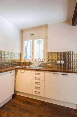 Cet appartement dispose d'une belle cuisine avec du parquet au sol et tout l'équipement indispensable pour votre quotidien : plaques de cuisson, réfrigerateur, congélateur, four, micro ondes, hotte, grille pain, bouilloire électrique, cafetière, etagère, placard, vaisselle.
