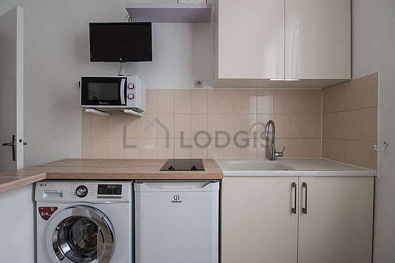 Cet appartement dispose d'une belle cuisine sur le séjour avec du parquet au sol et tout l'équipement essentiel pour votre quotidien : plaques de cuisson, réfrigerateur, micro ondes, freezer, cafetière, placard, vaisselle, 1 chaise(s), bar.