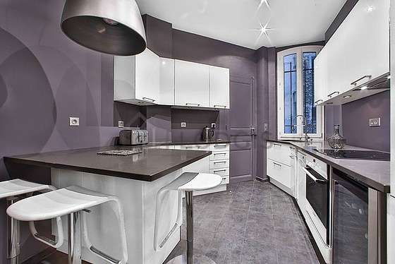 Cet appartement dispose d'une belle cuisine avec du carrelage au sol et tout l'équipement indispensable pour votre quotidien : plaques de cuisson, réfrigerateur, congélateur, four, micro ondes, hotte, grille pain, bouilloire électrique, cafetière, etagère, placard, vaisselle, tabouret, bar.