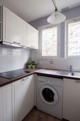 Cet appartement dispose d'une belle cuisine avec du parquet au sol et tout l'équipement nécessaire pour votre quotidien : plaques de cuisson, réfrigerateur, micro ondes, hotte, grille pain, placard, vaisselle, tabouret, bar.