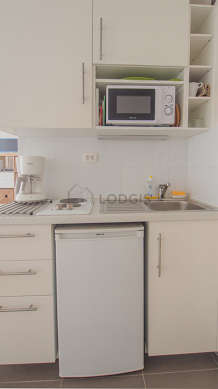Cet appartement dispose d'une belle cuisine avec du carrelage au sol et tout l'équipement indispensable pour votre quotidien : plaques de cuisson, réfrigerateur, micro ondes, freezer, grille pain, bouilloire électrique, cafetière, etagère, placard, vaisselle.