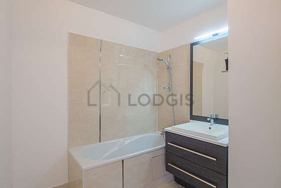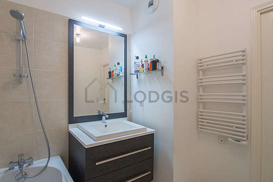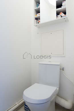 Cet appartement est équipé d'une salle de bain agréable et claire. Cette salle d'eau bénéficie du nécessaire pour votre bien-être au quotidien : serviettes de bain, etagère, placard, baignoire, sèche cheveux, radiateur sèche-serviettes. Les toilettes sont séparées de la salle de bain et situées dans une pièce indépendante.