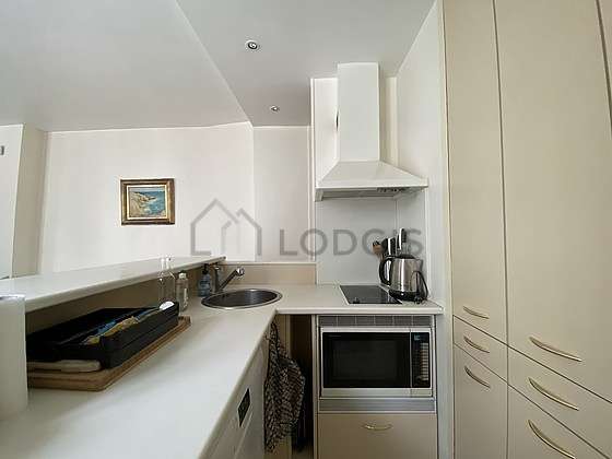 Cet appartement dispose d'une magnifique cuisine avec du carrelage au sol et tout l'équipement essentiel pour votre quotidien : plaques de cuisson, réfrigerateur, micro onde combiné, freezer, bouilloire électrique, cafetière, etagère, placard, vaisselle, bar.