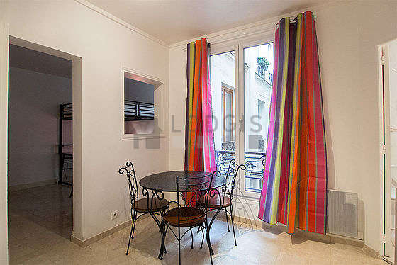 Cet appartement est composé d'un salon avec du carrelage au sol et des fenêtres double vitrage. Ce salon calme est meublé et équipé pour rendre votre séjour agréable : table à manger, etagère, 3 chaise(s).