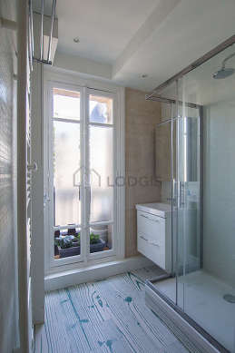 Cet appartement est équipé d'une salle de bain agréable et claire avec des fenêtres. Cette salle d'eau bénéficie du nécessaire pour votre bien-être au quotidien : serviettes de bain, etagère, placard, douche séparée, sèche cheveux, radiateur sèche-serviettes. Les toilettes sont séparées de la salle de bain et situées dans une pièce indépendante.