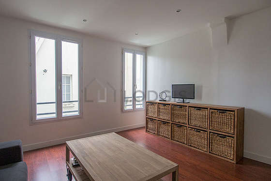 Cet appartement est composé d'un charmant salon avec du parquet au sol et des fenêtres double vitrage et vue sur rue. Ce salon calme est meublé et équipé pour rendre votre séjour agréable : télé, canapé, table basse, commode.
