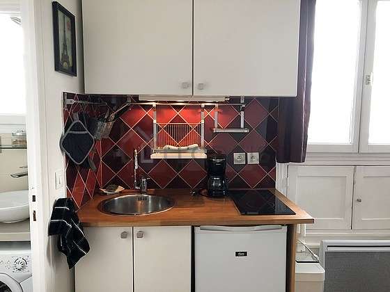 Cet appartement dispose d'une magnifique cuisine avec du parquet au sol et tout l'équipement indispensable pour votre quotidien : plaques de cuisson, réfrigerateur, micro ondes, freezer, grille pain, bouilloire électrique, cafetière, etagère, placard, vaisselle.