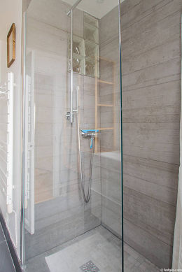 Cet appartement est équipé d'une salle de bain magnifique et très claire avec des fenêtres double vitrage. Cette salle d'eau bénéficie du nécessaire pour votre bien-être au quotidien : etagère, douche séparée, radiateur sèche-serviettes. Les toilettes sont séparées de la salle de bain et situées dans une pièce indépendante.