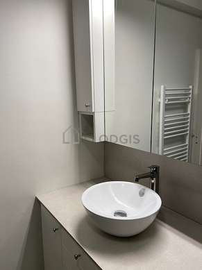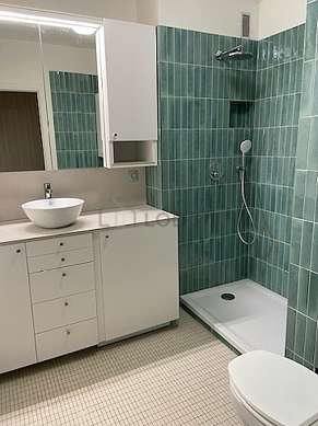Cet appartement est équipé d'une salle de bain agréable et claire. Cette salle d'eau bénéficie du nécessaire pour votre bien-être au quotidien : serviettes de bain, etagère, placard, douche séparée, etendoir, lavabo, lave main, miroir, porte serviettes, radiateur sèche-serviettes. Les toilettes sont intégrées dans la salle de bain.
