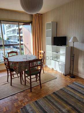 Cet appartement est composé d'un plaisant salon avec du parquet au sol et des fenêtres avec balcon et vue sur jardin. Ce salon calme est meublé et équipé pour rendre votre séjour agréable : télé, draps, couettes, réfrigerateur, table à manger, penderie, bibliothèque, etagère, commode, placard, vaisselle, 4 chaise(s), table de chevet, etendoir, lampadaire sur pied, meuble tv, miroir, poubelle, tableau, tapis, vase1 canapé(s) lit(s) de 160cm.