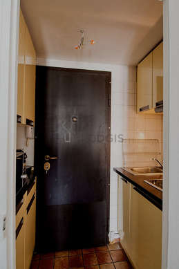 Cet appartement dispose d'une belle cuisine avec du carrelage au sol et tout l'équipement indispensable pour votre quotidien : plaques de cuisson, réfrigerateur, micro onde combiné, hotte, grille pain, bouilloire électrique, cafetière, placard, vaisselle.