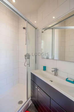 Cet appartement est équipé d'une salle de bain agréable et claire. Cette salle d'eau bénéficie du nécessaire pour votre bien-être au quotidien : serviettes de bain, placard, douche séparée, radiateur sèche-serviettes. Les toilettes sont séparées de la salle de bain et situées dans une pièce indépendante.
