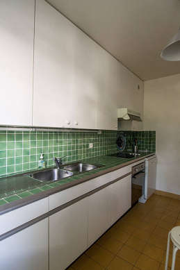 Cet appartement dispose d'une belle cuisine avec du carrelage au sol et tout l'équipement indispensable pour votre quotidien : plaques de cuisson, réfrigerateur, congélateur, four, micro ondes, hotte, grille pain, bouilloire électrique, cafetière, table à manger, placard, vaisselle, 2 chaise(s), tabouret.