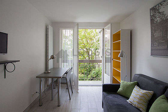 Cet appartement est composé d'un charmant salon avec du carrelage au sol et des fenêtres et vue sur jardin. Ce salon très calme est meublé et équipé pour rendre votre séjour agréable : télé, draps, couettes, table basse, bureau, penderie, etagère, placard, 3 chaise(s)1 canapé(s) lit(s) de 140cm.