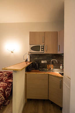 Cet appartement dispose d'une belle cuisine avec du parquet au sol et tout l'équipement indispensable pour votre quotidien : plaques de cuisson, réfrigerateur, micro ondes, freezer, hotte, grille pain, bouilloire électrique, cafetière, placard, vaisselle.