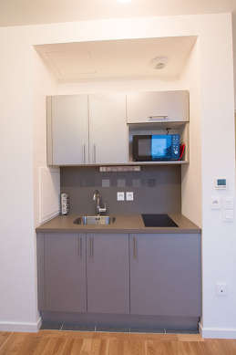 Cet appartement dispose d'une magnifique cuisine avec du parquet au sol et tout l'équipement essentiel pour votre quotidien : plaques de cuisson, réfrigerateur, micro ondes, freezer, hotte, etagère, placard, vaisselle.