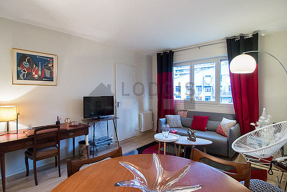 SéjourCet appartement est composé d'un séduisant salon avec du parquet au sol et des fenêtres double vitrage et vue sur jardin. Ce salon très calme est meublé et équipé pour rendre votre séjour agréable : télé, 1 fauteuil(s), table à manger, table basse, bureau, etagère, buffet, placard, 5 chaise(s), tabouret1 canapé(s) lit(s) de 140cm.