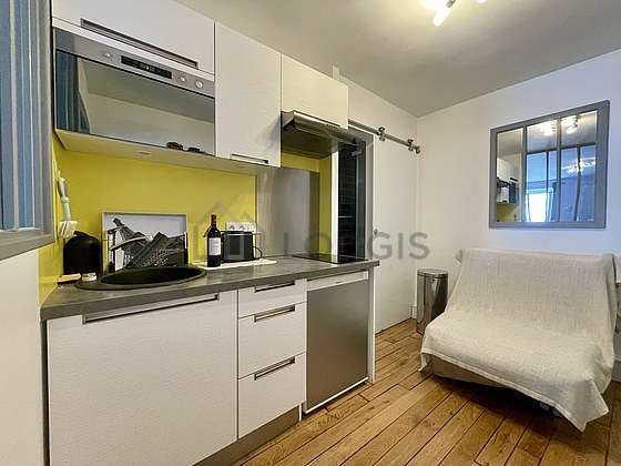 Cet appartement dispose d'une belle cuisine avec du parquet au sol et tout l'équipement essentiel pour votre quotidien : plaques de cuisson, réfrigerateur, micro onde combiné, freezer, hotte, grille pain, bouilloire électrique, cafetière, 1 fauteuil(s), table à manger, vaisselle, 2 chaise(s).