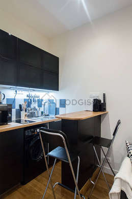 Cet appartement dispose d'une cuisine avec du parquet au sol et tout l'équipement indispensable pour votre quotidien : plaques de cuisson, réfrigerateur, micro onde combiné, freezer, grille pain, bouilloire électrique, cafetière, etagère, placard, tabouret, bar.