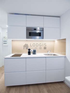 Cet appartement dispose d'une magnifique cuisine avec du parquet au sol et tout l'équipement indispensable pour votre quotidien : plaques de cuisson, réfrigerateur, micro ondes, freezer, bouilloire électrique, cafetière, placard, vaisselle.