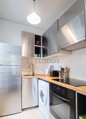 Cet appartement dispose d'une magnifique cuisine avec du carrelage au sol et tout l'équipement indispensable pour votre quotidien : plaques de cuisson, réfrigerateur, congélateur, four, hotte, grille pain, bouilloire électrique, etagère, placard, vaisselle.