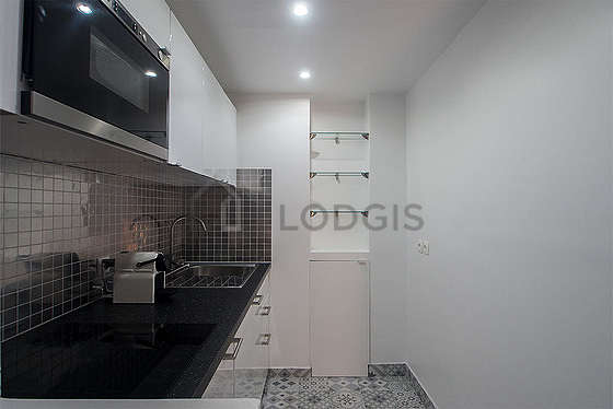Cet appartement dispose d'une belle cuisine avec du carrelage au sol et tout l'équipement essentiel pour votre quotidien : plaques de cuisson, réfrigerateur, micro ondes, freezer, cafetière, etagère, placard, vaisselle.