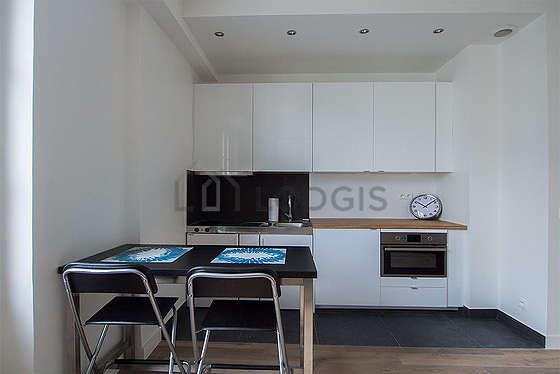 Cet appartement dispose d'une belle cuisine avec du carrelage au sol et tout l'équipement nécessaire pour votre quotidien : plaques de cuisson, réfrigerateur, micro onde combiné, hotte, grille pain, bouilloire électrique, cafetière, etagère, placard, vaisselle, 2 chaise(s), bar.